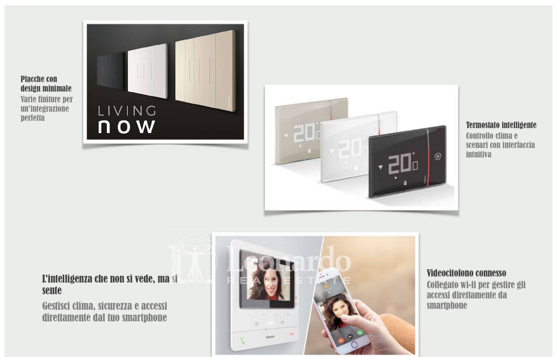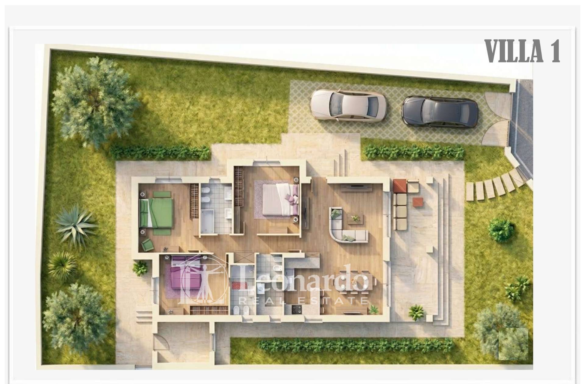 The villas are Energy Class A4 and equipped with Smart Home technologies for remote management of air conditioning, security, and smartphone access. Key features include underfloor heating, integrated cooling, and private parking spaces with electric vehicle charging stations.