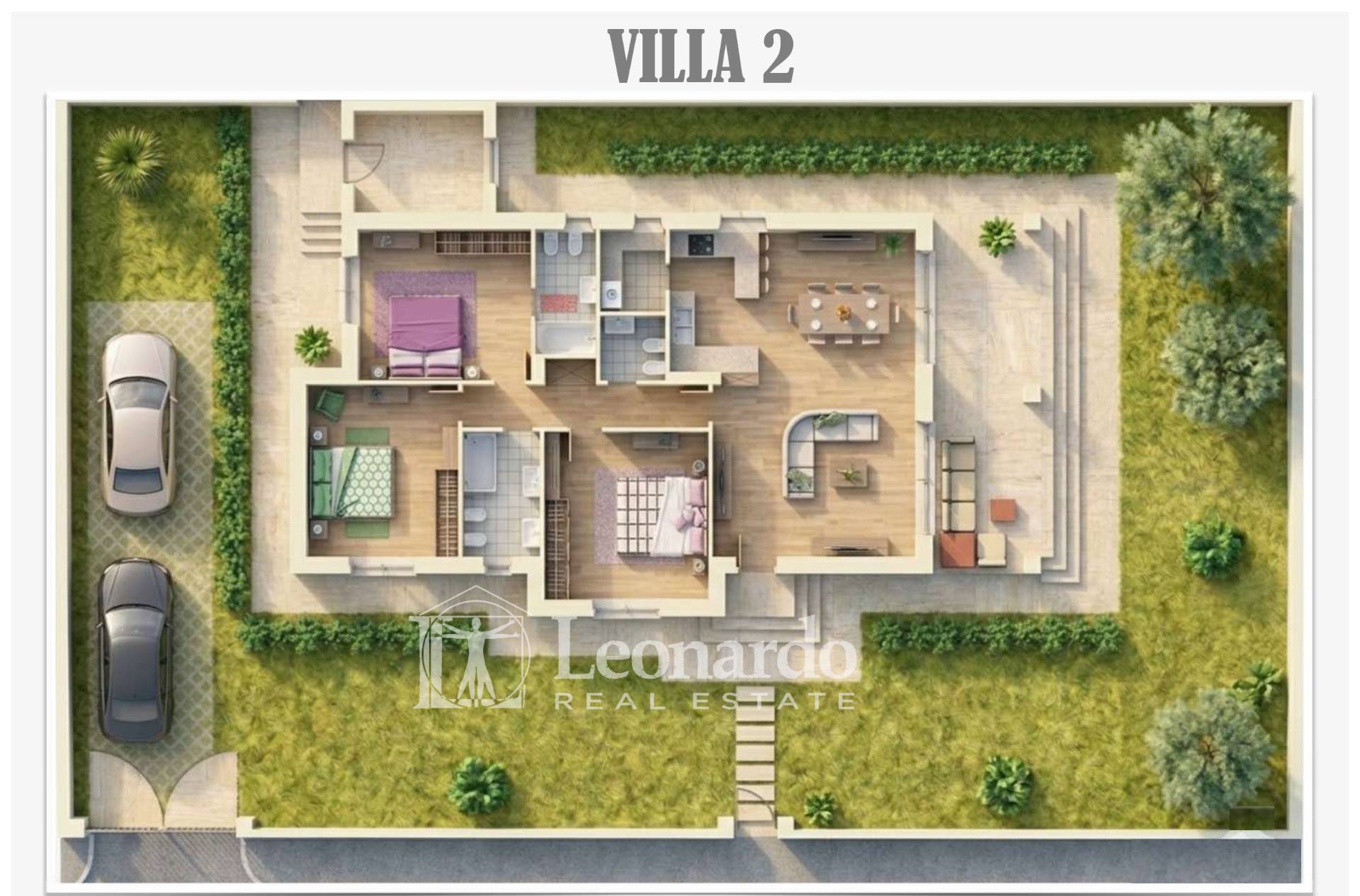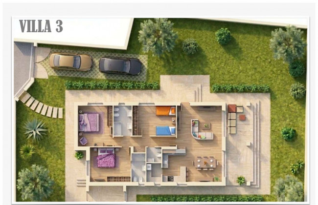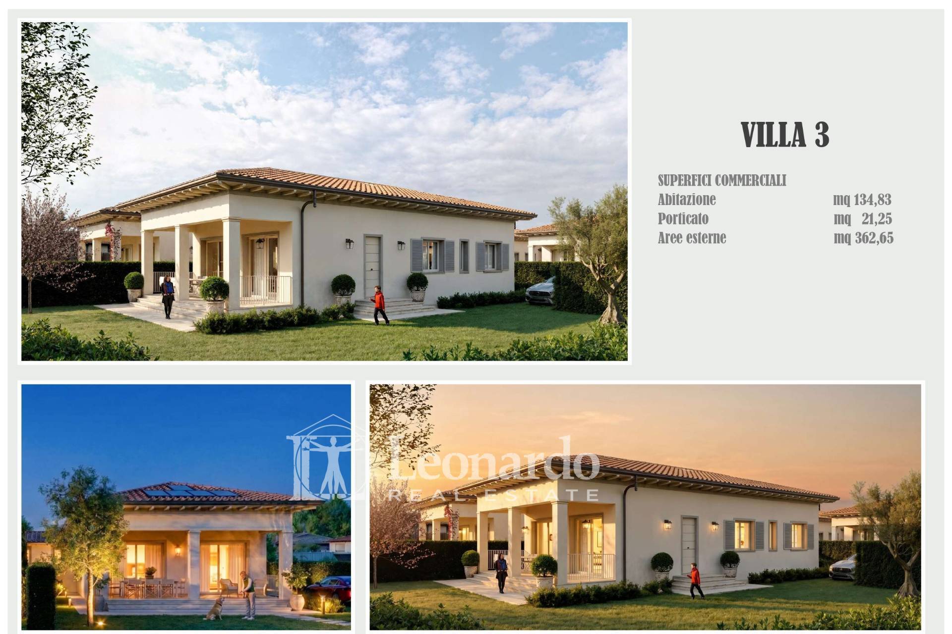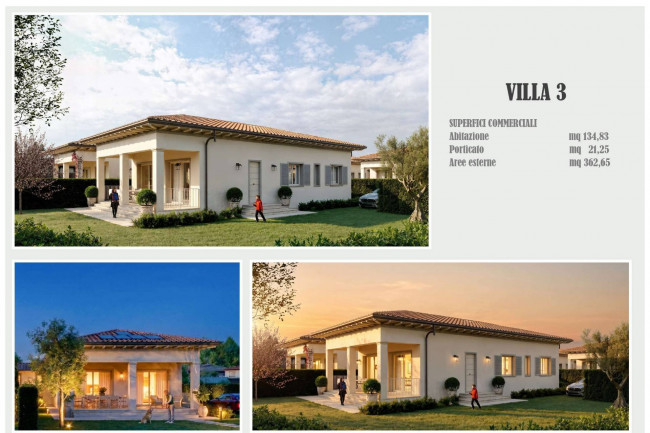Each villa spans approximately 135 square meters, featuring modern, bright, and functional spaces. The living area features a spacious open plan with a kitchen and dining area, ideal for socializing and relaxing. The sleeping area includes three bedrooms, three elegantly designed bathrooms, and a convenient laundry area. Private terraces complete the property, ensuring privacy and pleasant views.