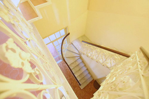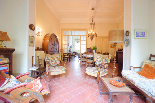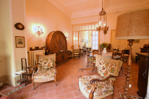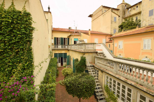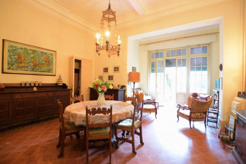 Al piano terreno ci accoglie un ampio disimpegno in cui la grande scala curva dei primi del '900 la fa da padrone e ci invita poi a seguirla i piani superiori. Il piano si sviluppa con un primo grande salone con camino, una sala doppia affacciata sulla corte , una cucina, due bagni ed un corridoio che ci conduce alle due stanze da letto situate nella caratteristica costruzione in fondo alla corte.
