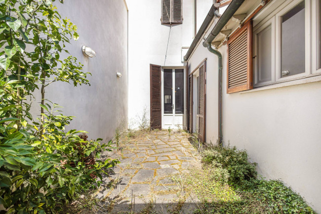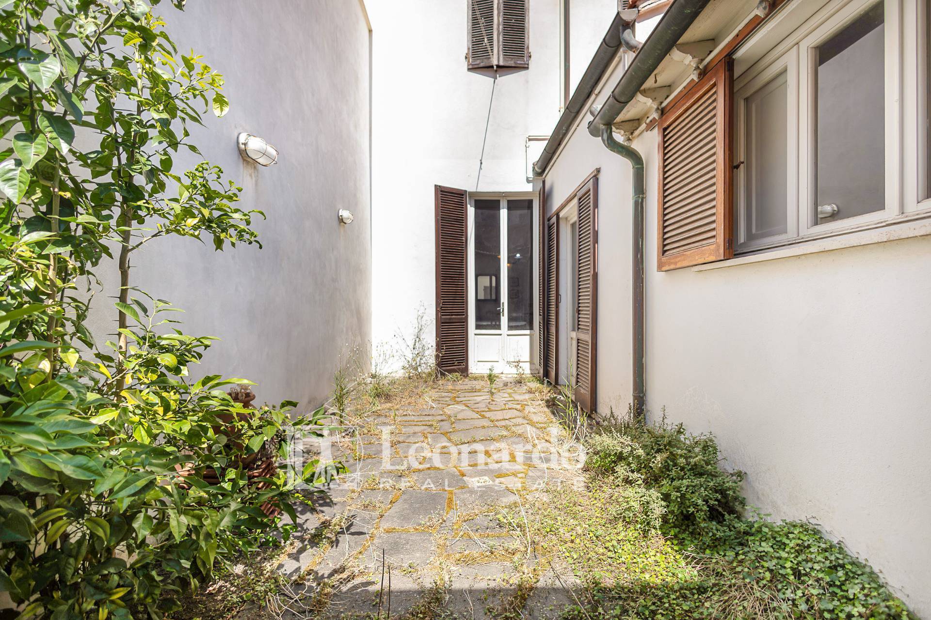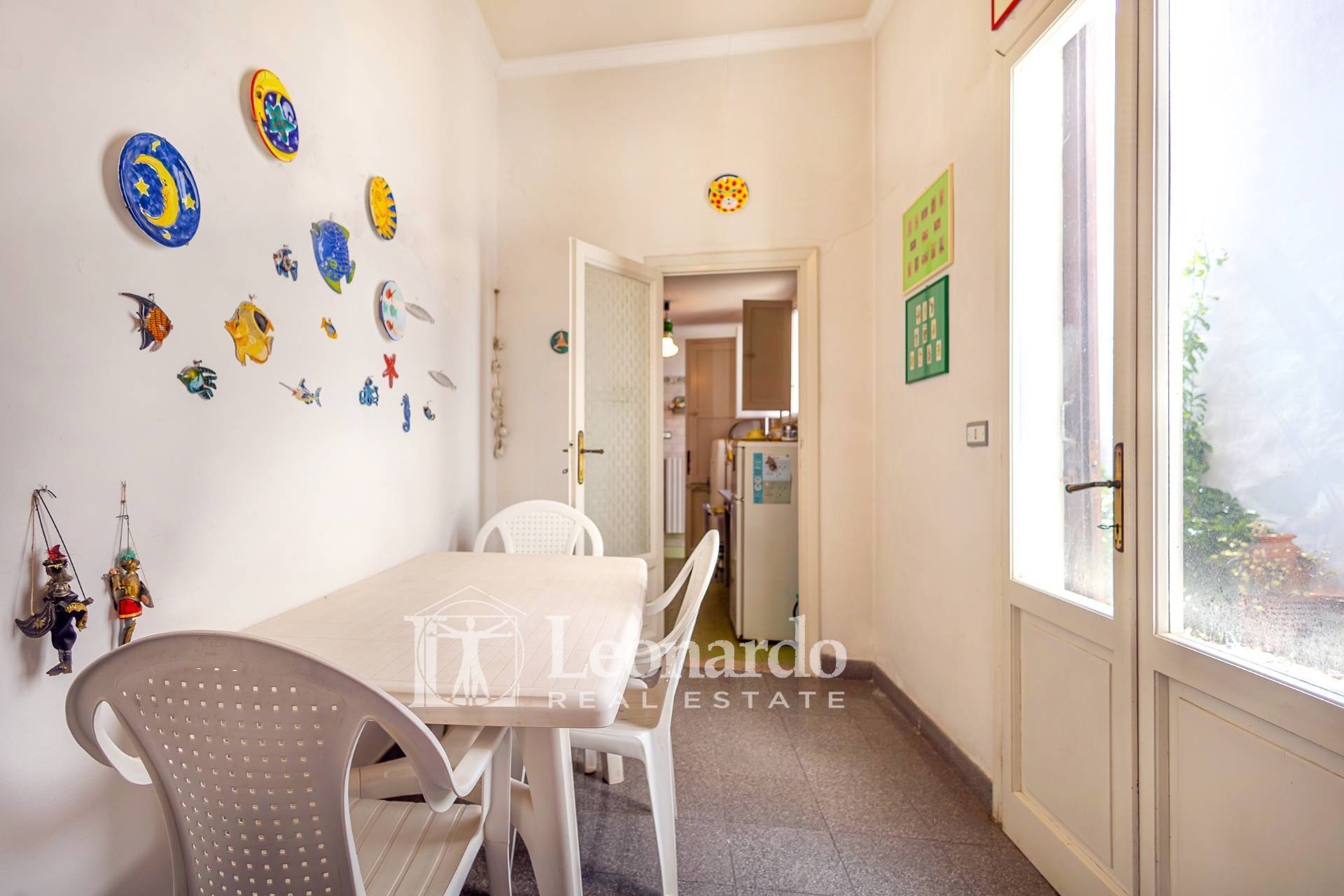 Una luminosa sala da pranzo si apre sulla corte interna privata, perfetta per pranzi all’aperto e momenti di relax.