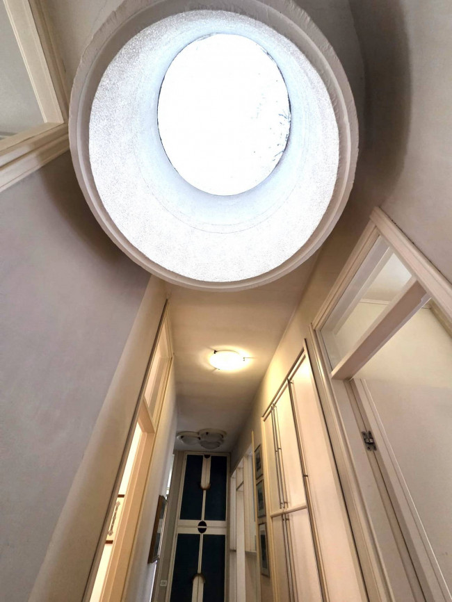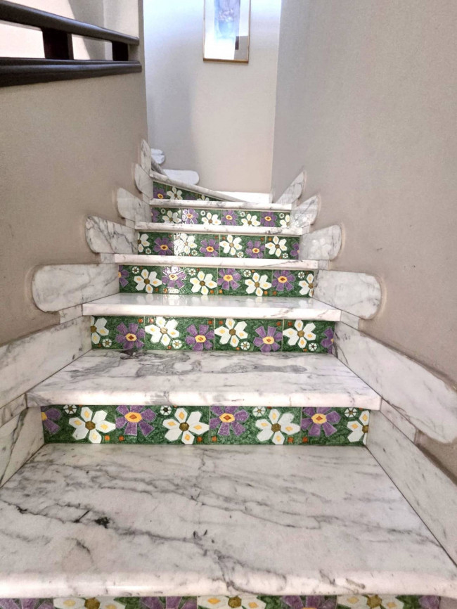 Le scale private interne in marmo ci conducono al piano primo dove si sviluppa l'abitazione. Una grande sala doppia corredata di 4 finestre, con salotto ed angolo pranzo arricchita da due balconi si presenta come lo spazio protagonista. Da qui la seconda sala pranzo e la cucina abitabile con altro balcone e la dispensa completano la zona giorno.