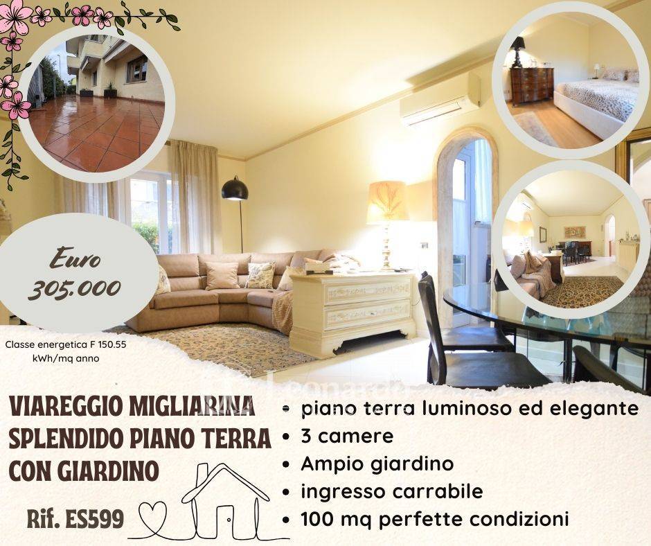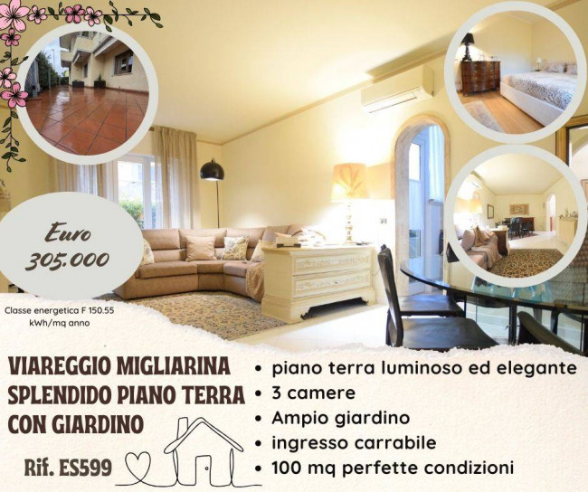 Nel tranquillo e ricercato quartiere della Migliarina a Viareggio, proponiamo in Vendita Appartamento al piano terra di circa 100 mq, in ottime condizioni, elegante e arredato con gusto, subito abitabile.