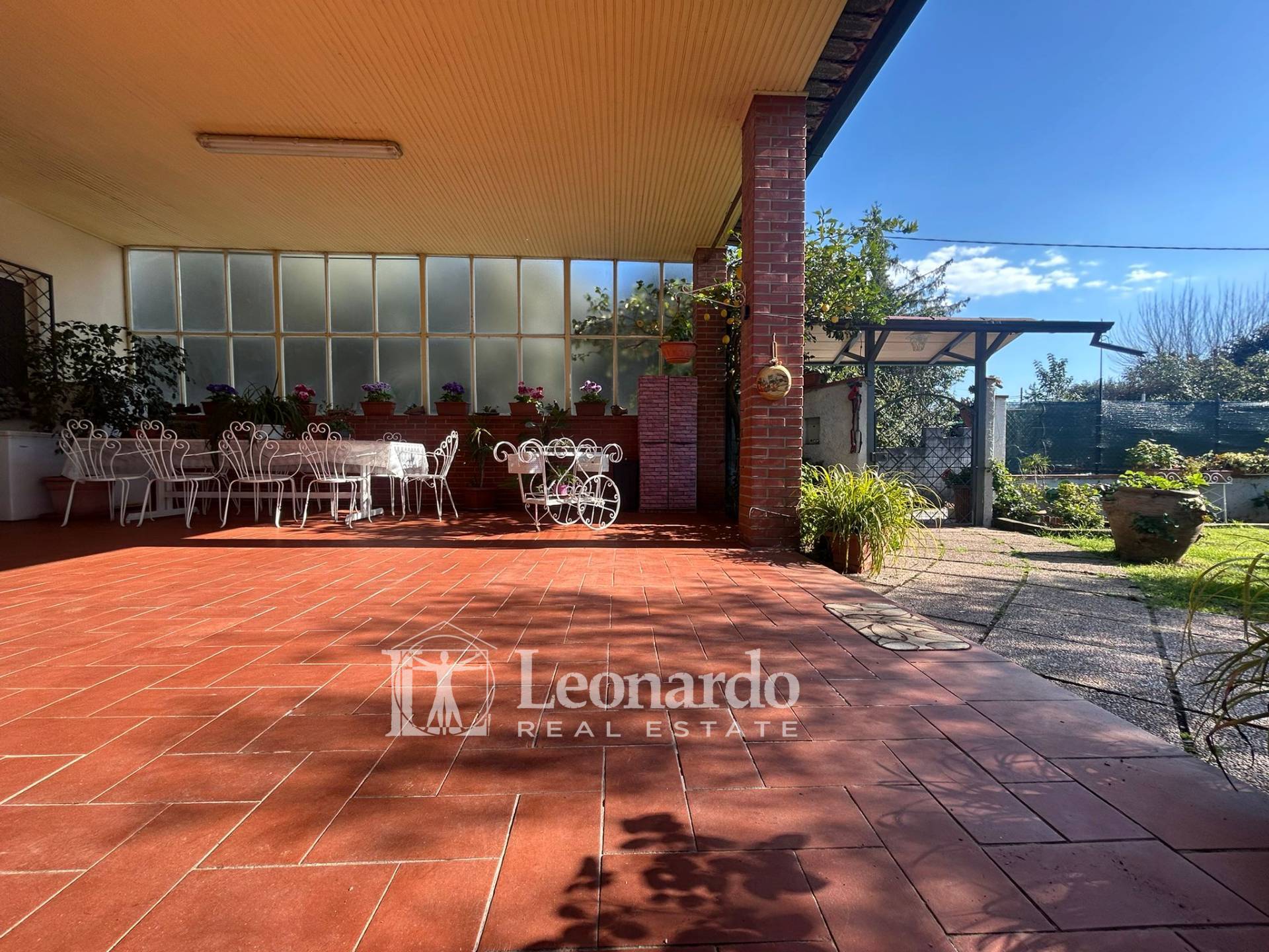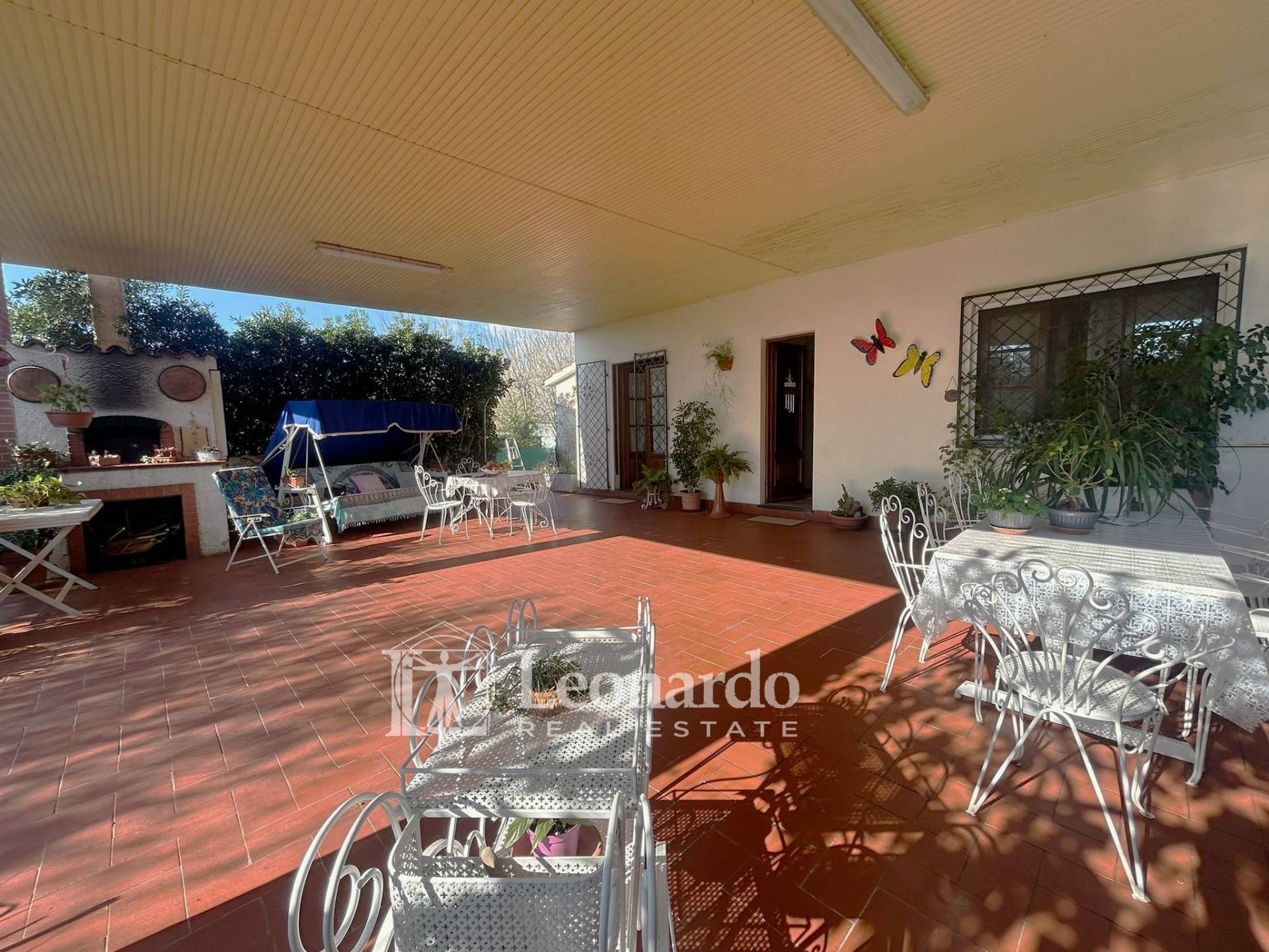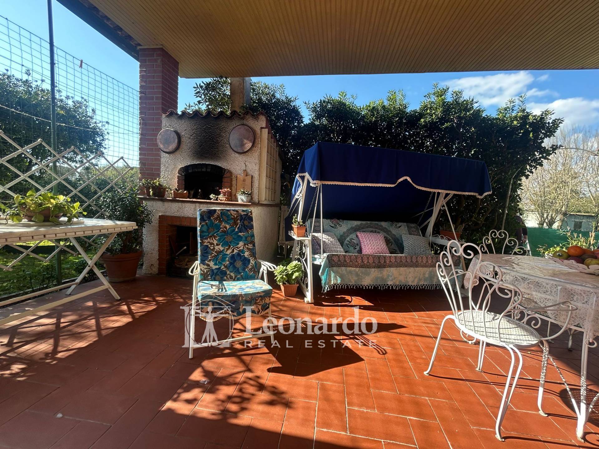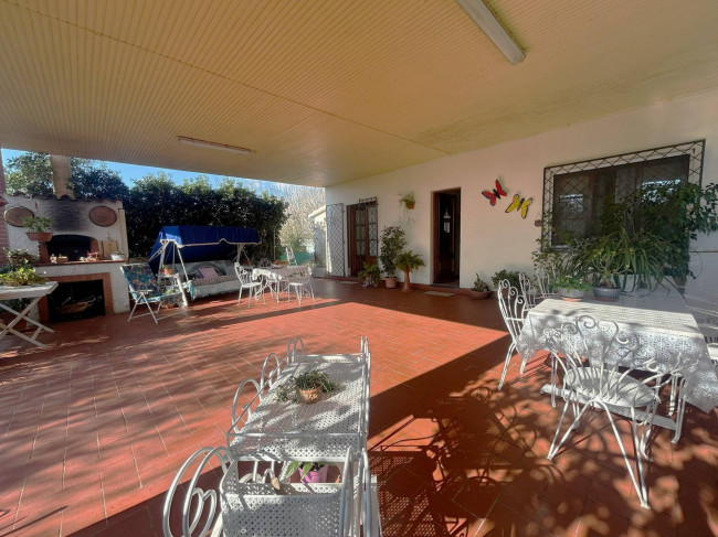 Prima dell’ingresso all'interno della casa, spicca un grande porticato di oltre 80 mq, interamente piastrellato, perfetta per pranzi, cene e momenti di convivialità all’aperto, con zona relax, tavolo da pranzo ampio e forno in muratura, che rende la zona ideale anche come spazio living esterno coperto.