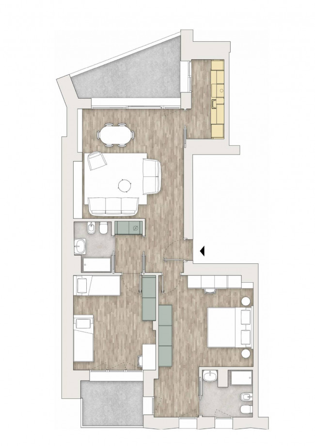 L'Appartamento è al momento arredato solo nella cucina e nei bagni con mobili e accessori di design, garantendo un'atmosfera elegante e raffinata.